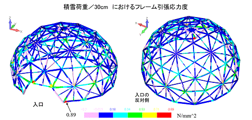 積雪時には球面全体としては天頂部を中心に沈み込むが、最大変位は剛性が低下している開口部である入口に発生する。