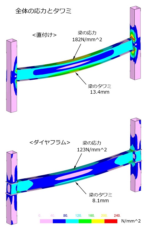 直付けの場合はダイヤフラムに較べタワミが大きく、その影響で梁の応力も高くなっている。